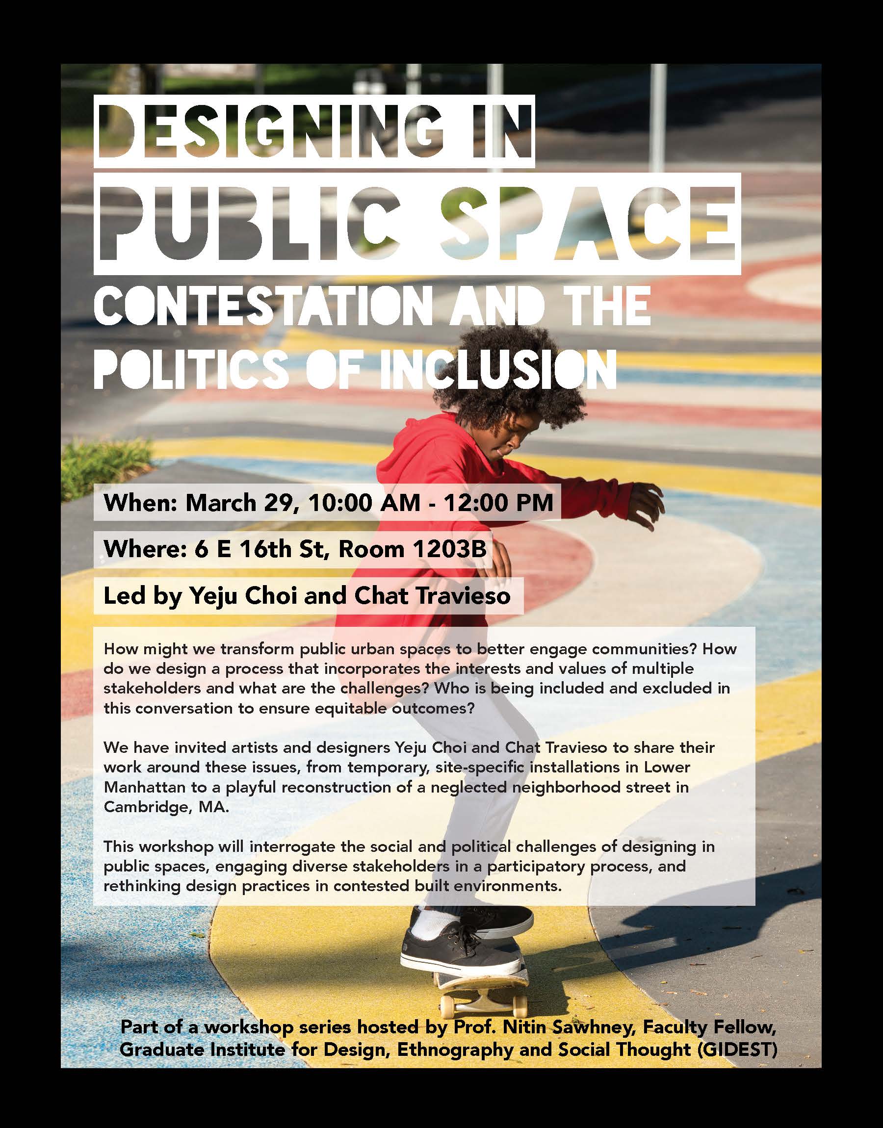 This workshop will interrogate the social and political challenges of designing in public spaces, engaging diverse stakeholders in a participatory process, and rethinking design practices in contested built environments.