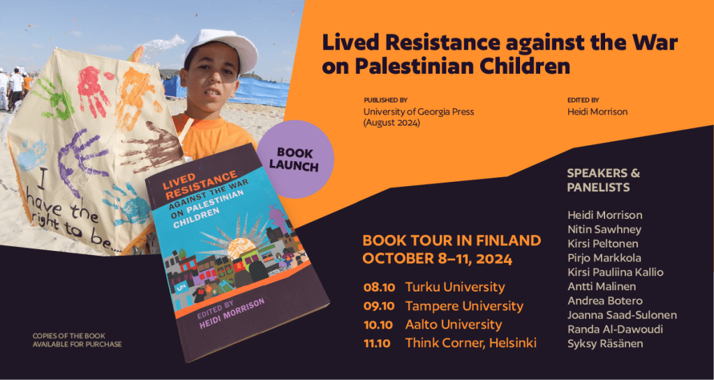 Join us for the launch of a critical new book, Lived Resistance against the War on Palestinian Children, edited by Heidi Morrison and published by University of Georgia Press (August 1, 2024). We are launching our book tour with talks & panels hosted in Turku, Tampere & Helsinki from October 8-11 and hope you can attend one of them.