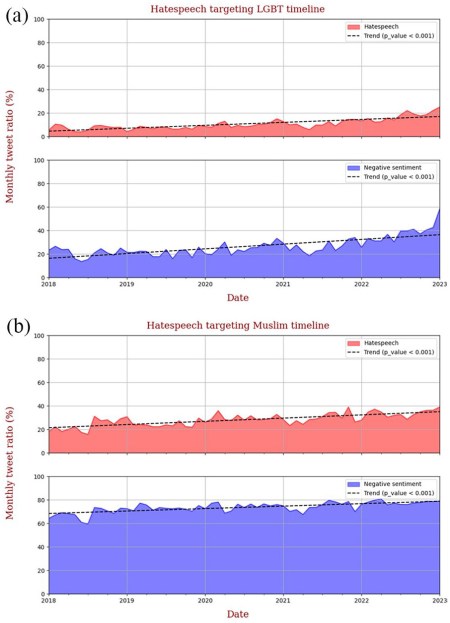 Abstract: This study investigates online hate speech in Finland, particularly Twitter messages targeting people of Muslim faith and the LGBTQ+ community, using a mixed-methods approach that combines quantitative text classification with a BERT model and qualitative thematic analysis via BERTopic and examination of highly interacted posts from 2018 to 2023. The study shows increasing instances of hate speech occurring online, primarily against Muslims, with topic modeling uncovering 32 topics for Muslims and 41 for the LGBTQ+ community, featuring themes of violence, cultural conflict, and challenges to traditional values. The LGBTQ+ community is depicted as undermining traditional norms, whereas Muslims are presented with hostility. The research underscores the necessity for digital platforms to employ nuanced strategies to counter hate speech, advocating for policies that tackle hate speech while also addressing the underlying factors and enhancing understanding of the social and cultural contexts of the targeted groups to refine detection accuracy.